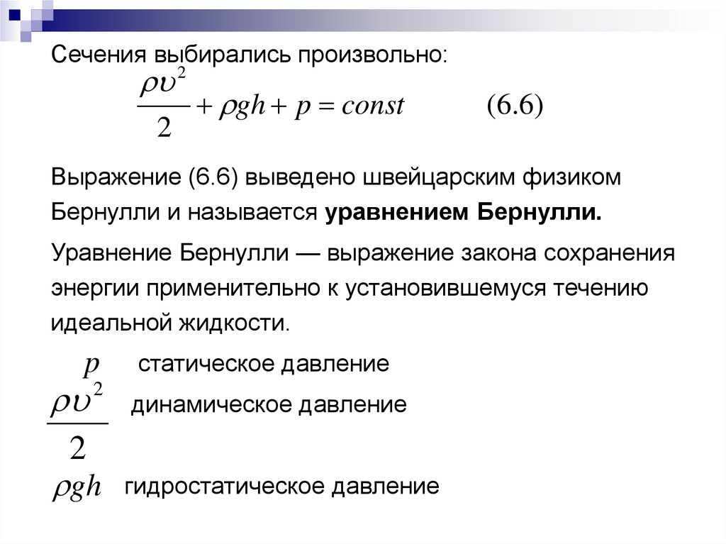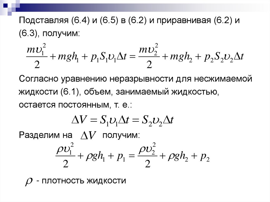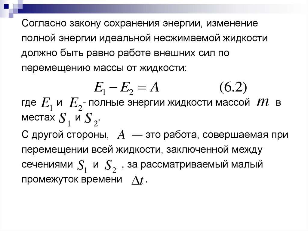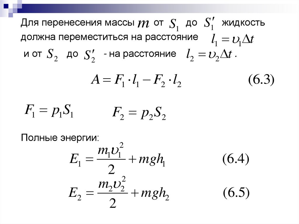 Согласно закону сохранения энергии, изменениеполной энергии идеальной несжимаемой жидкости