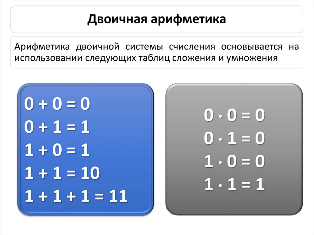 Двоичная арифметикаАрифметика двоичной системы счисления основывается на