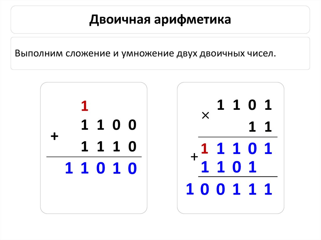 Двоичная арифметикаВыполним сложение и умножение двух двоичных чисел.