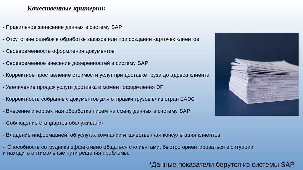 Качественные критерии:- Правильное занесение данных в систему SAP