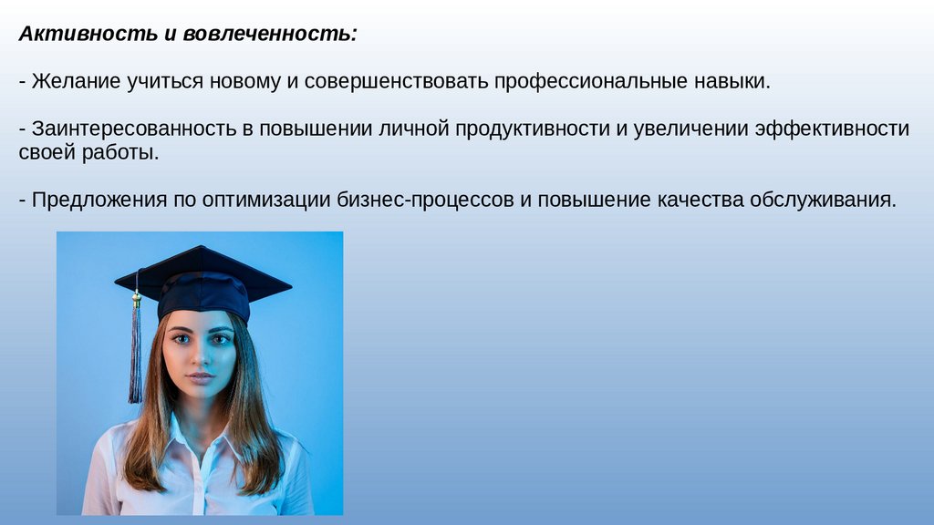Активность и вовлеченность:- Желание учиться новому и совершенствовать профессиональные навыки.