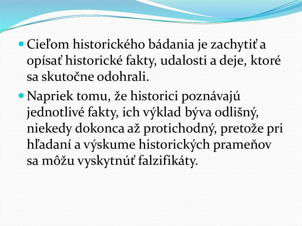 Cieľom historického bádania je zachytiť aopísať historické fakty, udalosti a deje, ktoré