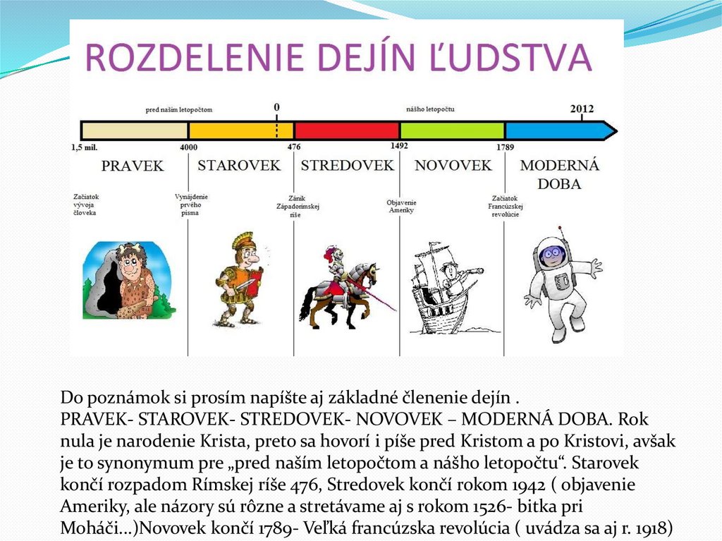Do poznámok si prosím napíšte aj základné členenie dejín .PRAVEK- STAROVEK- STREDOVEK- NOVOVEK – MODERNÁ DOBA. Rok