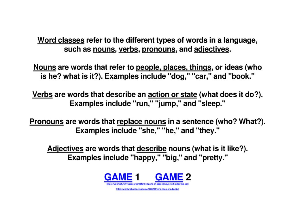 Word classes refer to the different types of words in a language,such as nouns, verbs, pronouns, and adjectives.