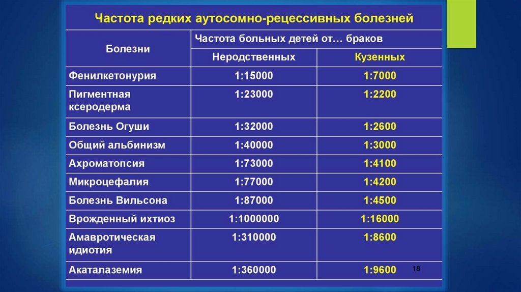 19. Частота аутосомно-рецессивных заболеваний и гетерозиготных носителей