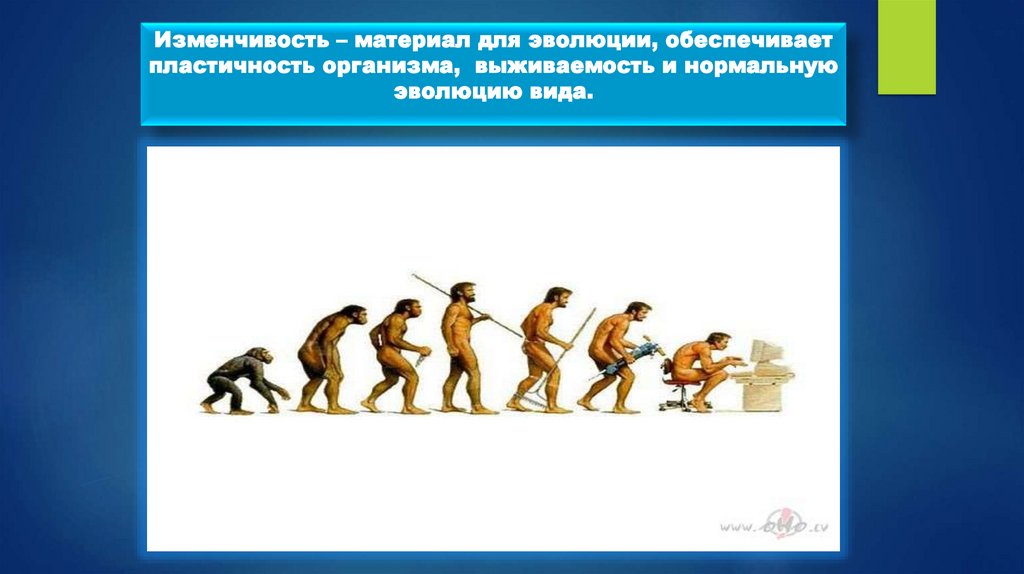 Изменчивость – материал для эволюции, обеспечиваетпластичность организма, выживаемость и нормальную