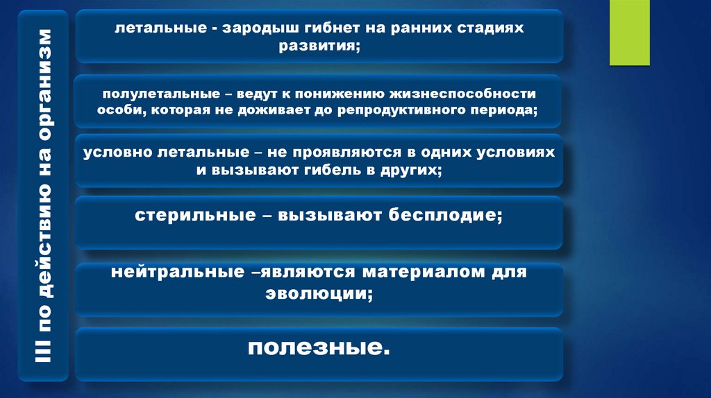 полулетальные – ведут к понижению жизнеспособности