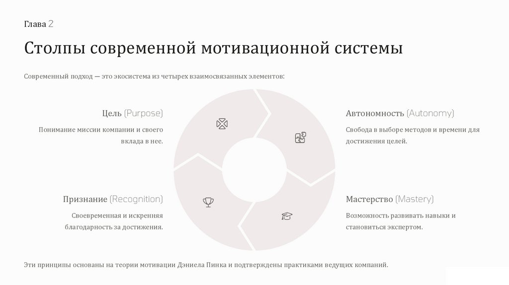 Эти принципы основаны на теории мотивации Дэниела Пинка и подтверждены практиками ведущих компаний.