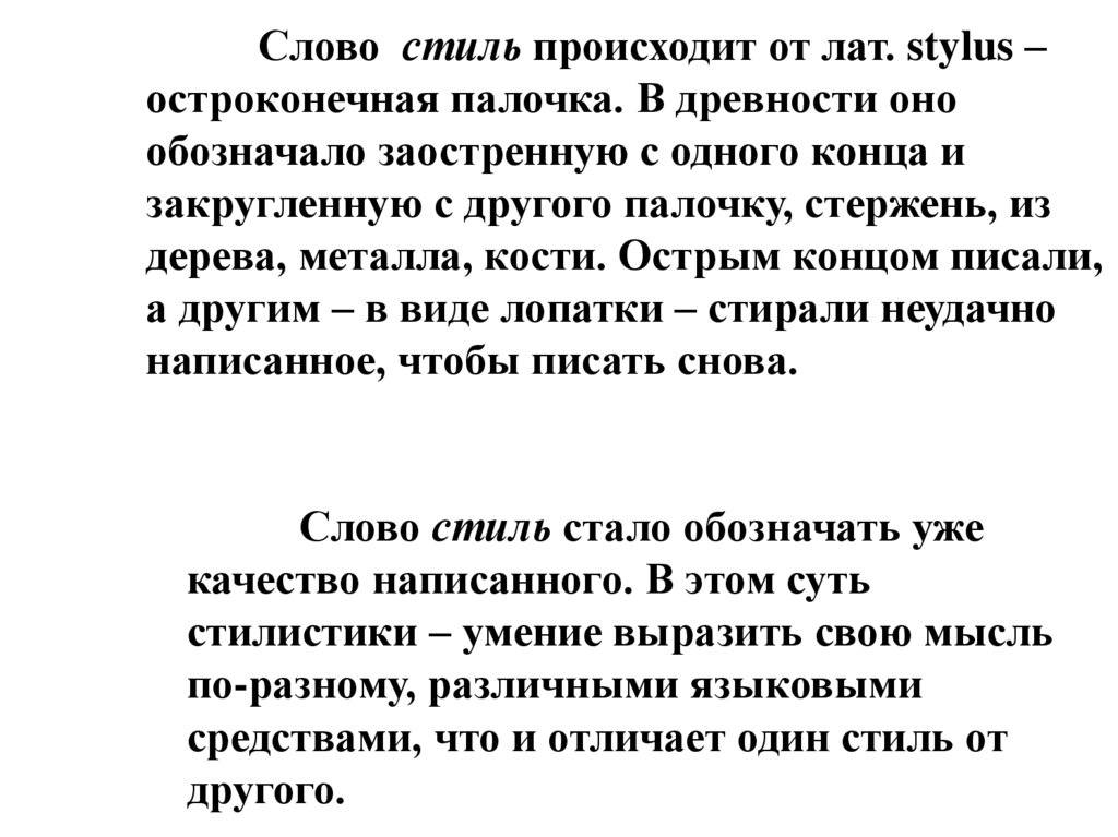Слово стиль происходит от лат. stylus –остроконечная палочка. В древности оно
