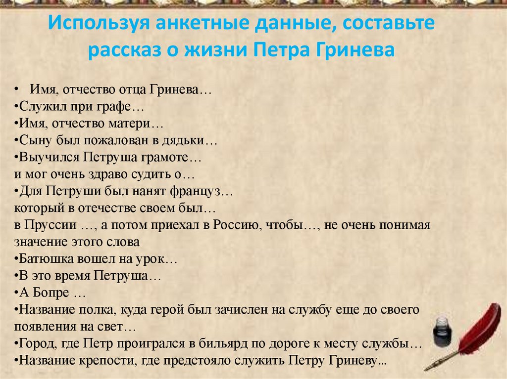 Используя анкетные данные, составьтерассказ о жизни Петра Гринева
