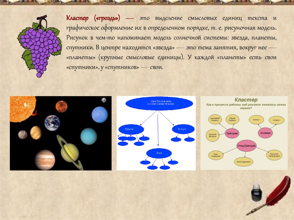 Кластер («гроздь») — это выделение смысловых единиц текста играфическое оформление их в определенном порядке, т. е. рисуночная модель.