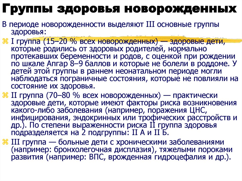 Группы здоровья новорожденныхВ периоде новорожденности выделяют III основные группы