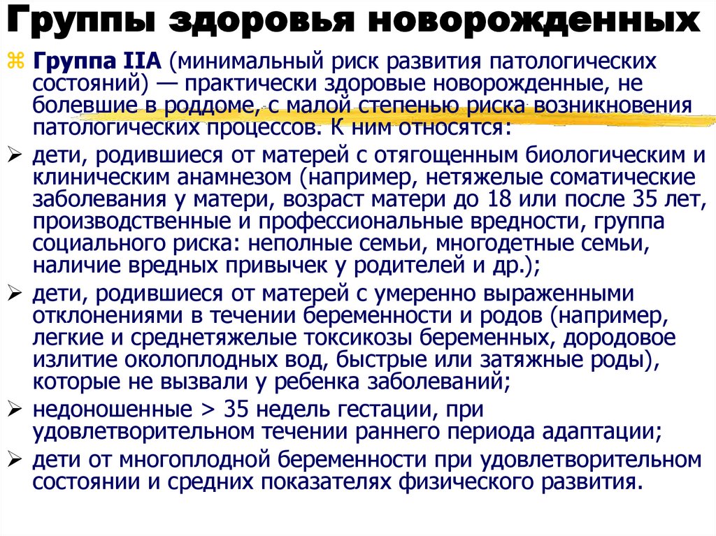 Группы здоровья новорожденныхГруппа IIA (минимальный риск развития патологических