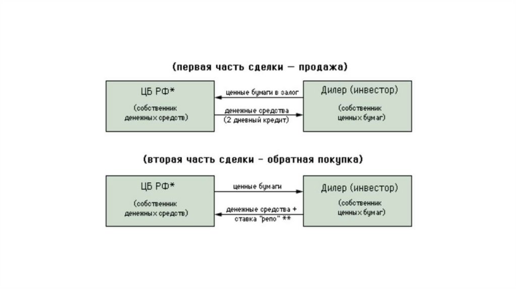 Представляют собой комбинацию срочной и кассовой сделок сценной бумагой, совершаемых в целях получения ссуды в форме