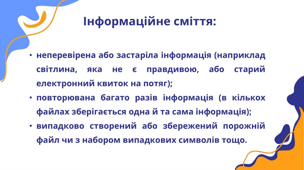 Інформаційне сміття:• неперевірена або застаріла інформація (наприклад