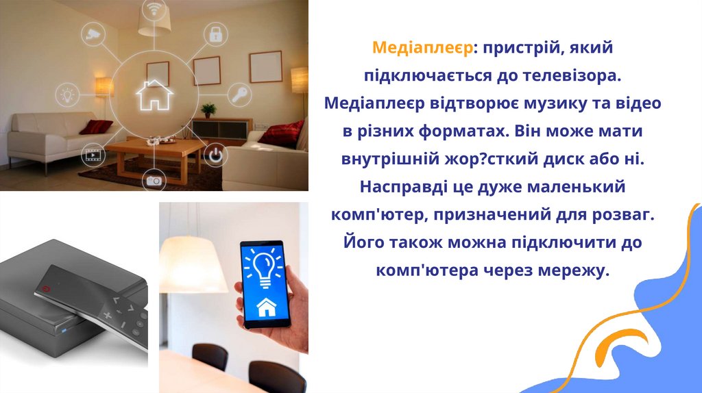 Медіаплеєр: пристрій, якийпідключається до телевізора.