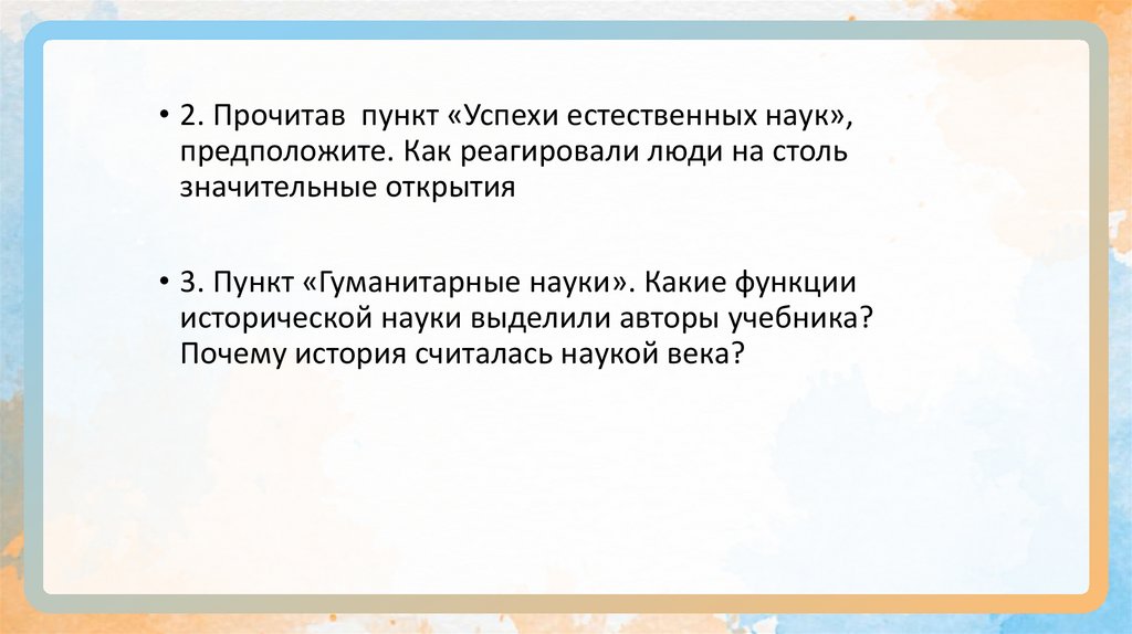 • 2. Прочитав пункт «Успехи естественных наук»,предположите. Как реагировали люди на столь