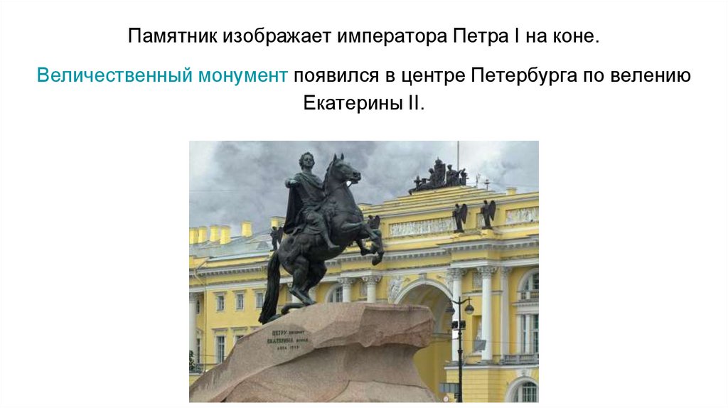 Памятник изображает императора Петра I на коне.Величественный монумент появился в центре Петербурга по велению