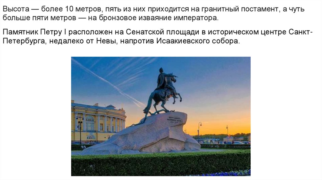 Памятник Петру I расположен на Сенатской площади в историческом центре СанктПетербурга, недалеко от Невы, напротив Исаакиевского собора.