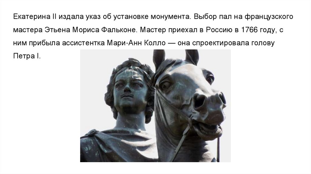 Екатерина II издала указ об установке монумента. Выбор пал на французскогомастера Этьена Мориса Фальконе. Мастер приехал в Россию в 1766 году, с