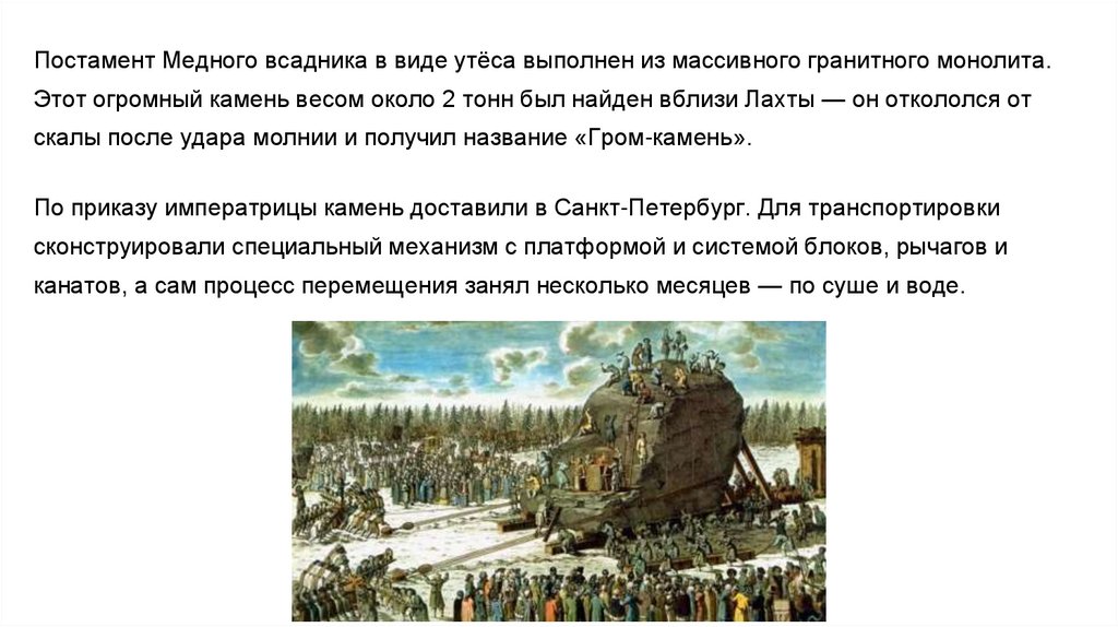 По приказу императрицы камень доставили в Санкт-Петербург. Для транспортировки