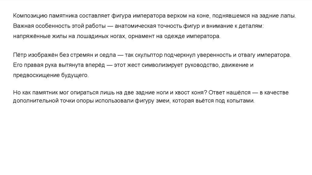 Пётр изображён без стремян и седла — так скульптор подчеркнул уверенность и отвагу императора.