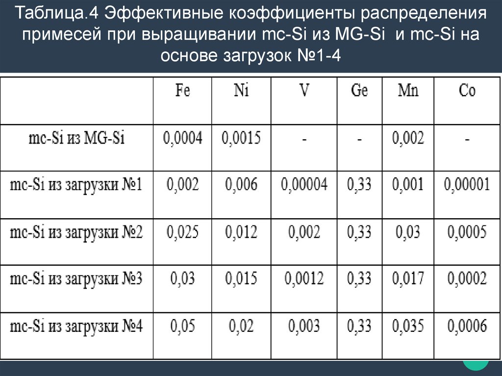 Распределение примесей в процессе выращивания мультикристаллического кремния