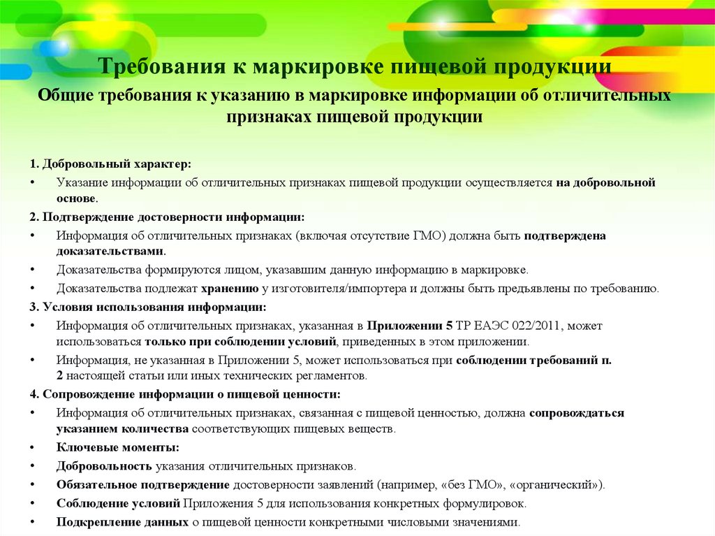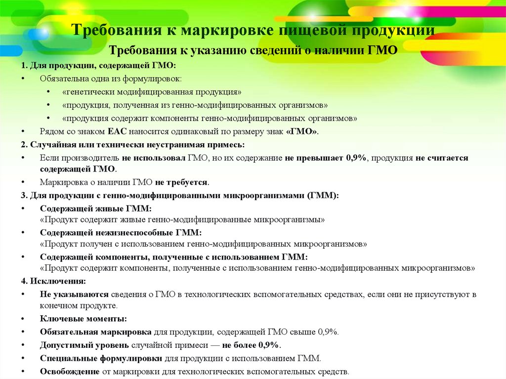 Требования к маркировке пищевой продукцииТребования к указанию сведений о наличии ГМО