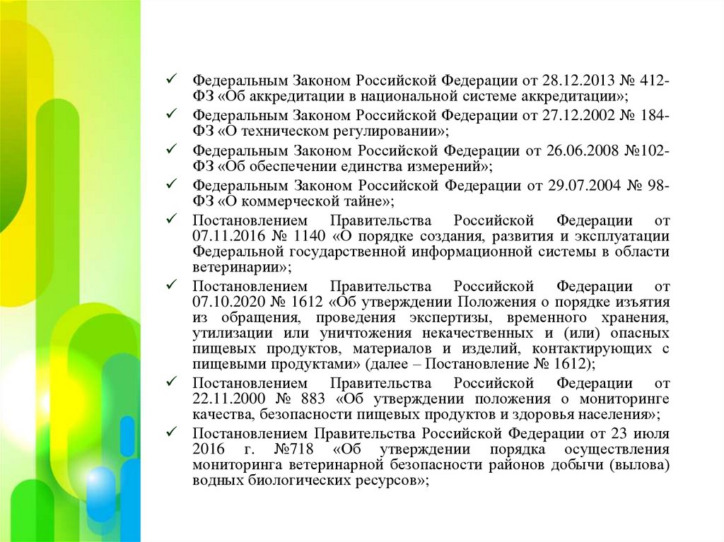 Федеральным Законом Российской Федерации от 28.12.2013 № 412ФЗ «Об аккредитации в национальной системе аккредитации»;Федеральным Законом Российской Федерации от 27.12.2002 № 184ФЗ «О техническом регулировании»;