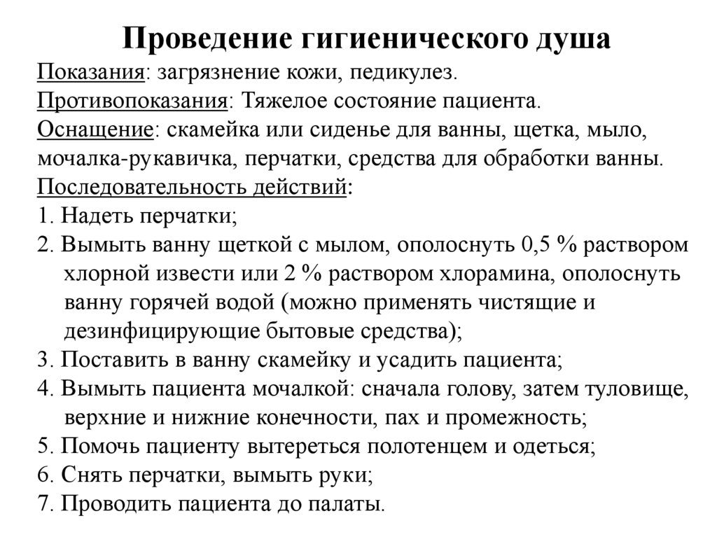 Проведение гигиенического душаПоказания: загрязнение кожи, педикулез.