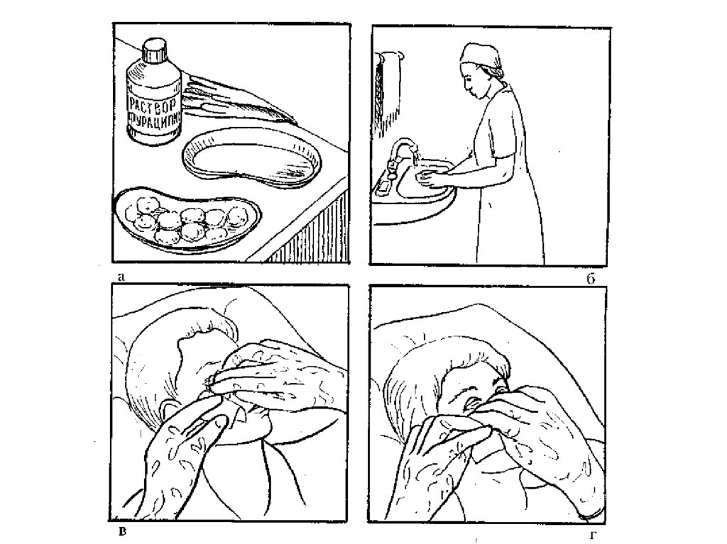 Оснащение: стерильный лоток, стерильные марлевые шарики,