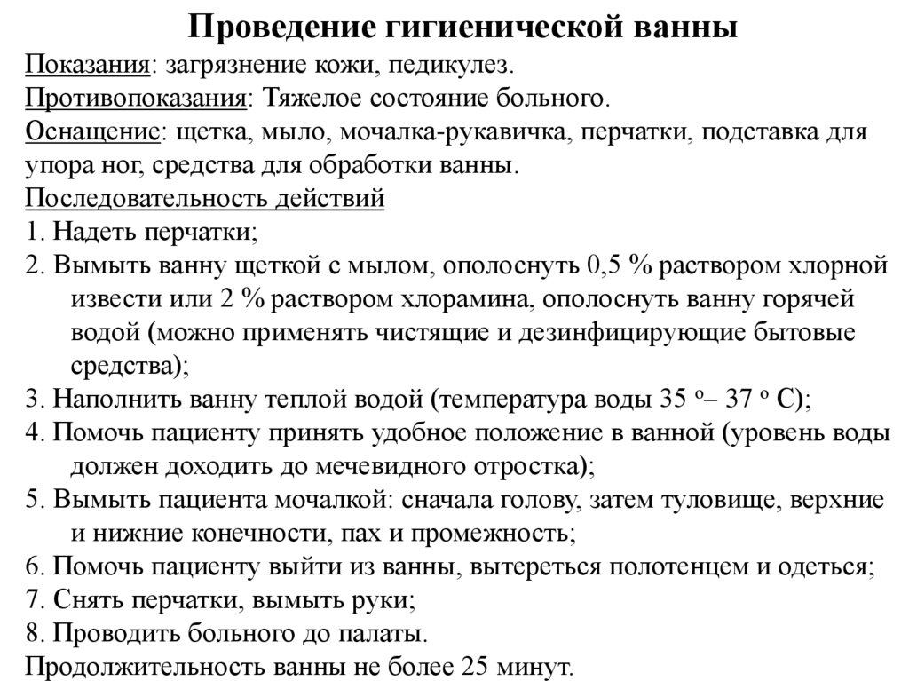 Проведение гигиенической ванныПоказания: загрязнение кожи, педикулез.