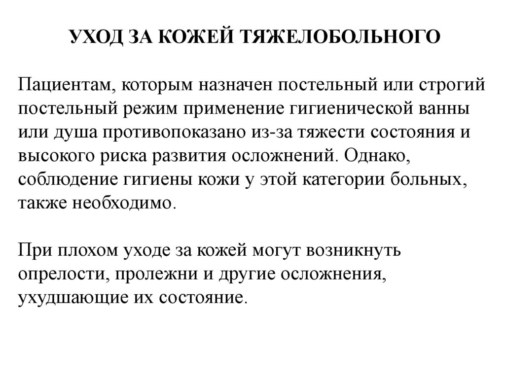 УХОД ЗА КОЖЕЙ ТЯЖЕЛОБОЛЬНОГОПациентам, которым назначен постельный или строгий
