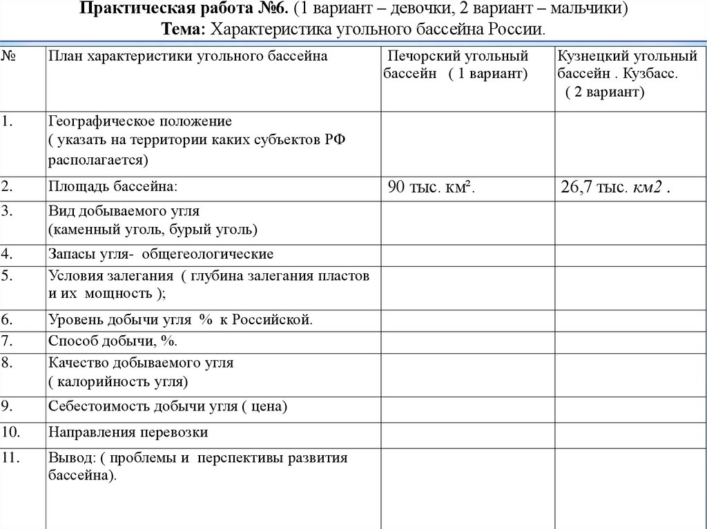 Практическая работа №6. (1 вариант – девочки, 2 вариант – мальчики)Тема: Характеристика угольного бассейна России.