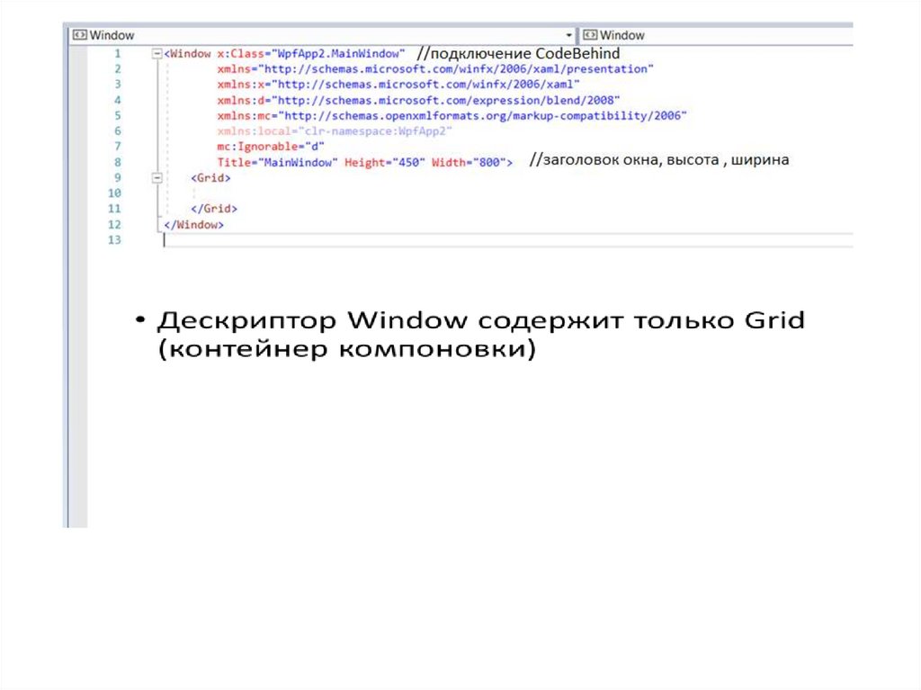•XAML — расширяемый язык разметки для описания UI.•Контролы — элементы управления (кнопки, текстовые поля, списки и
