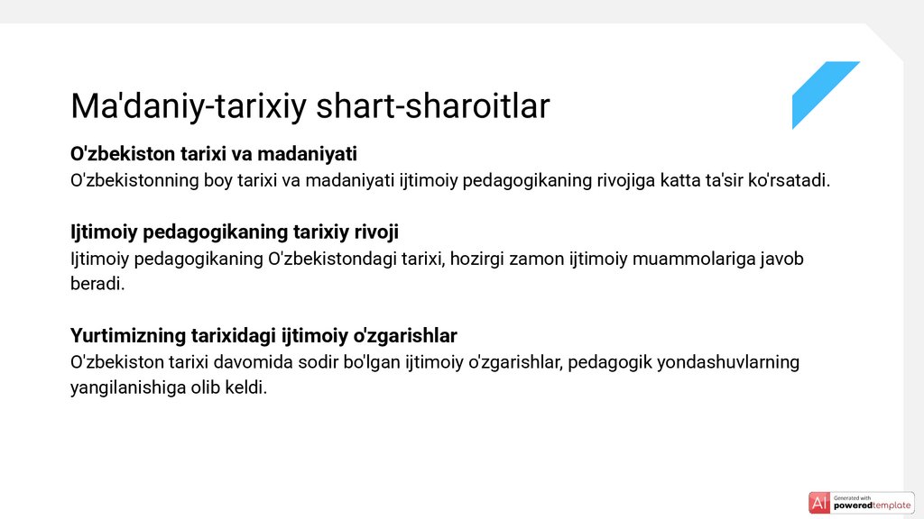 O'zbekistonning boy tarixi va madaniyati ijtimoiy pedagogikaning rivojiga katta ta'sir ko'rsatadi.