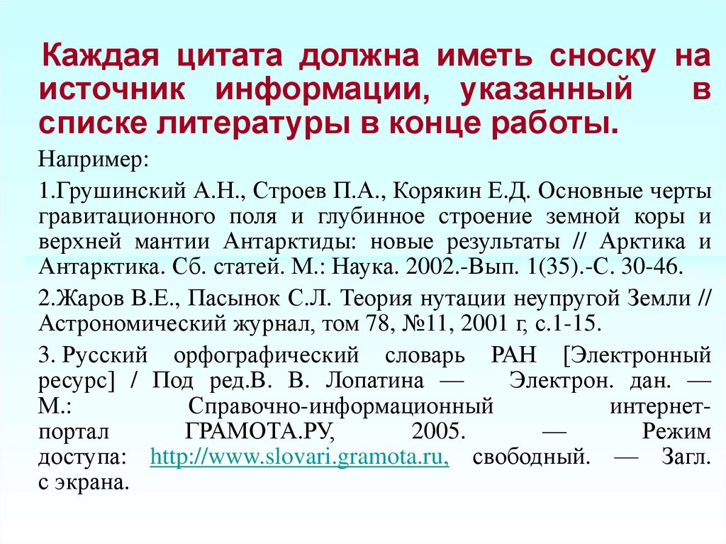 Каждая цитата должна иметь сноску наисточник информации, указанный