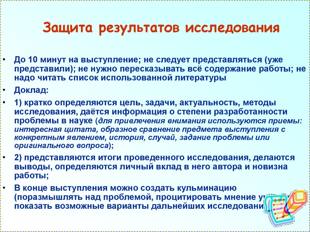 Защита результатов исследования• До 10 минут на выступление; не следует представляться (уже