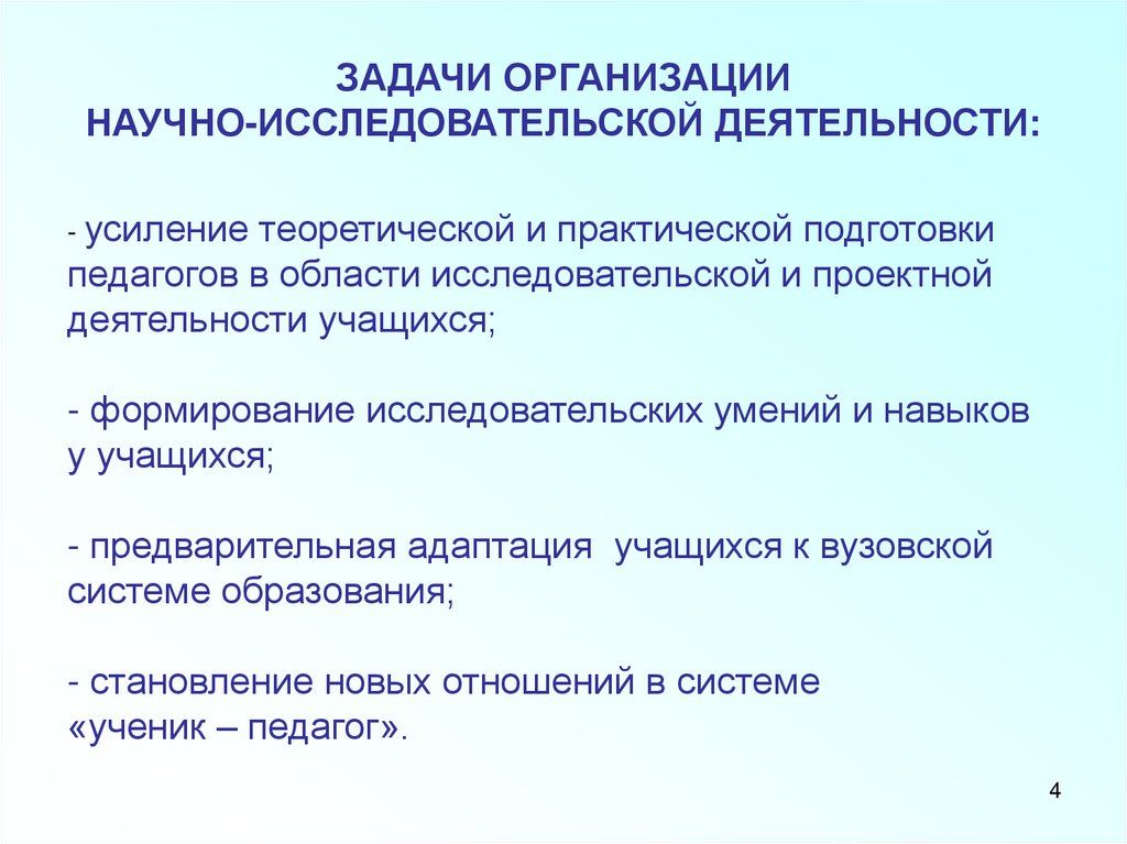 ЗАДАЧИ ОРГАНИЗАЦИИНАУЧНО-ИССЛЕДОВАТЕЛЬСКОЙ ДЕЯТЕЛЬНОСТИ: