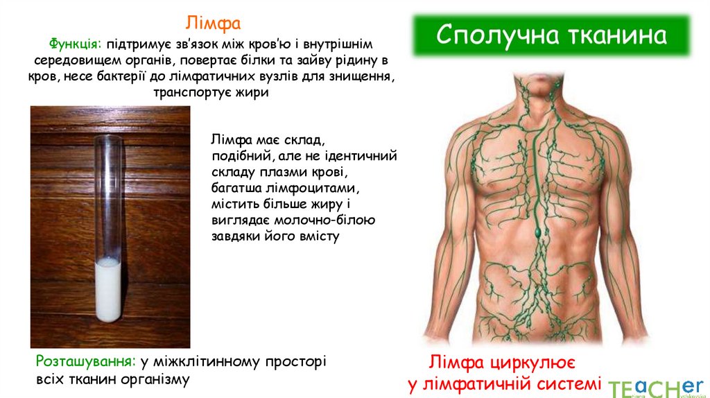 ЛімфаФункція: підтримує зв’язок між кров’ю і внутрішнім