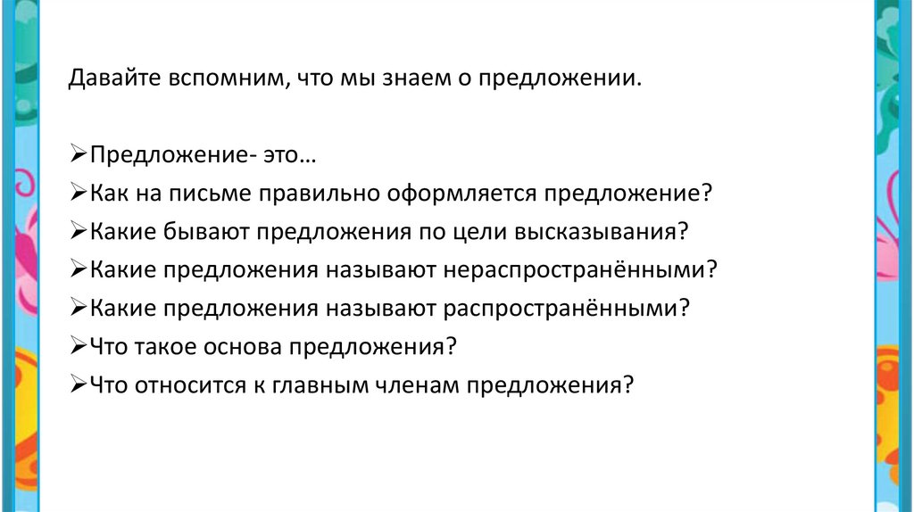 Давайте вспомним, что мы знаем о предложении.Предложение- это…