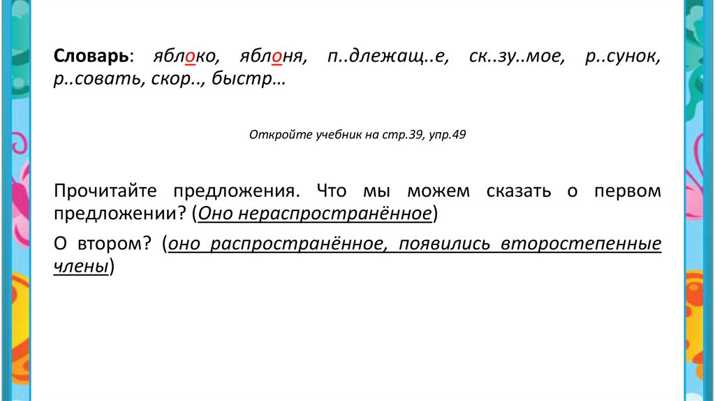Словарь: яблоко, яблоня, п..длежащ..е, ск..зу..мое, р..сунок,р..совать, скор.., быстр…