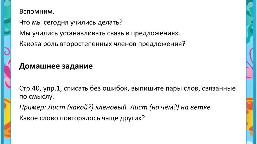 Пример: Лист (какой?) кленовый. Лист (на чём?) на ветке.