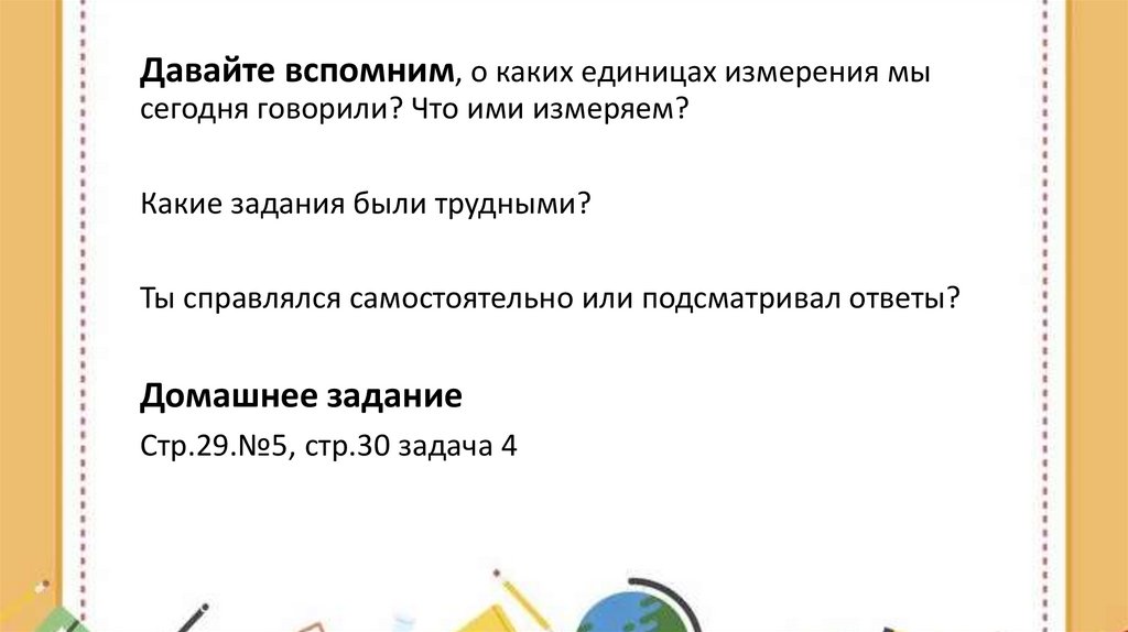 Давайте вспомним, о каких единицах измерения мысегодня говорили? Что ими измеряем?