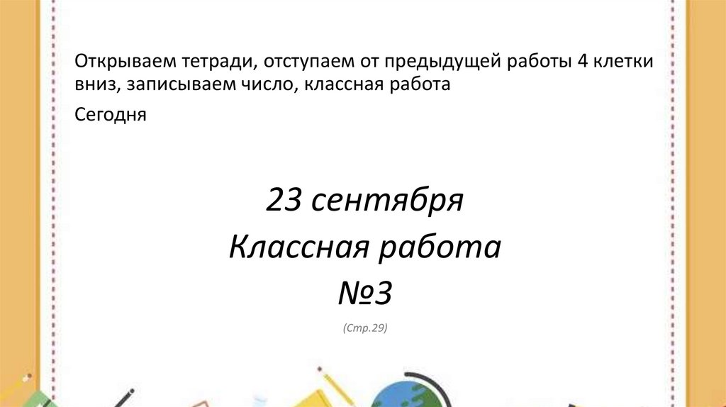 Открываем тетради, отступаем от предыдущей работы 4 клеткивниз, записываем число, классная работа