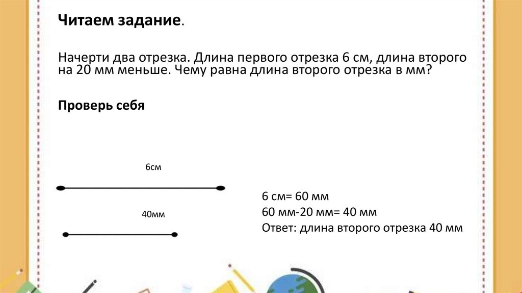 Читаем задание.Начерти два отрезка. Длина первого отрезка 6 см, длина второго