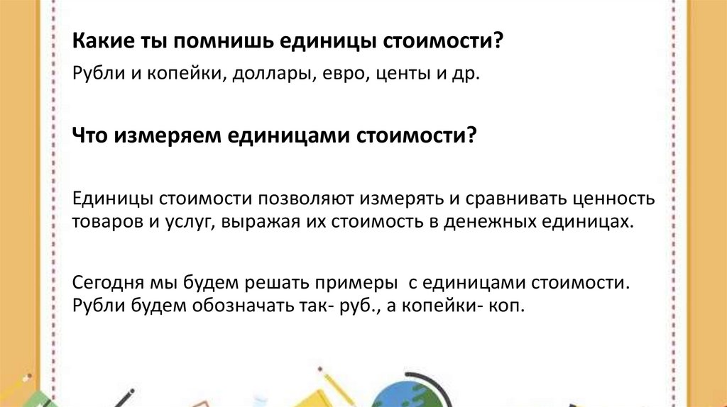 Какие ты помнишь единицы стоимости?Рубли и копейки, доллары, евро, центы и др.