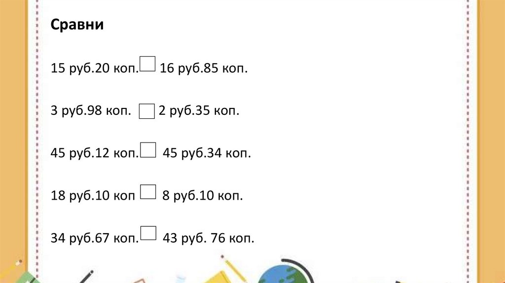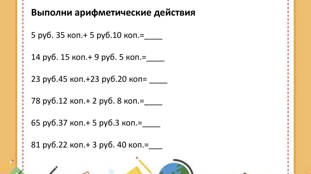 Выполни арифметические действия5 руб. 35 коп.+ 5 руб.10 коп.=____