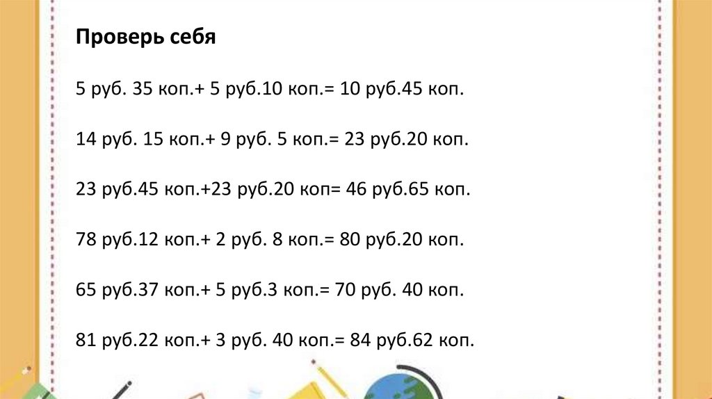 Проверь себя5 руб. 35 коп.+ 5 руб.10 коп.= 10 руб.45 коп.