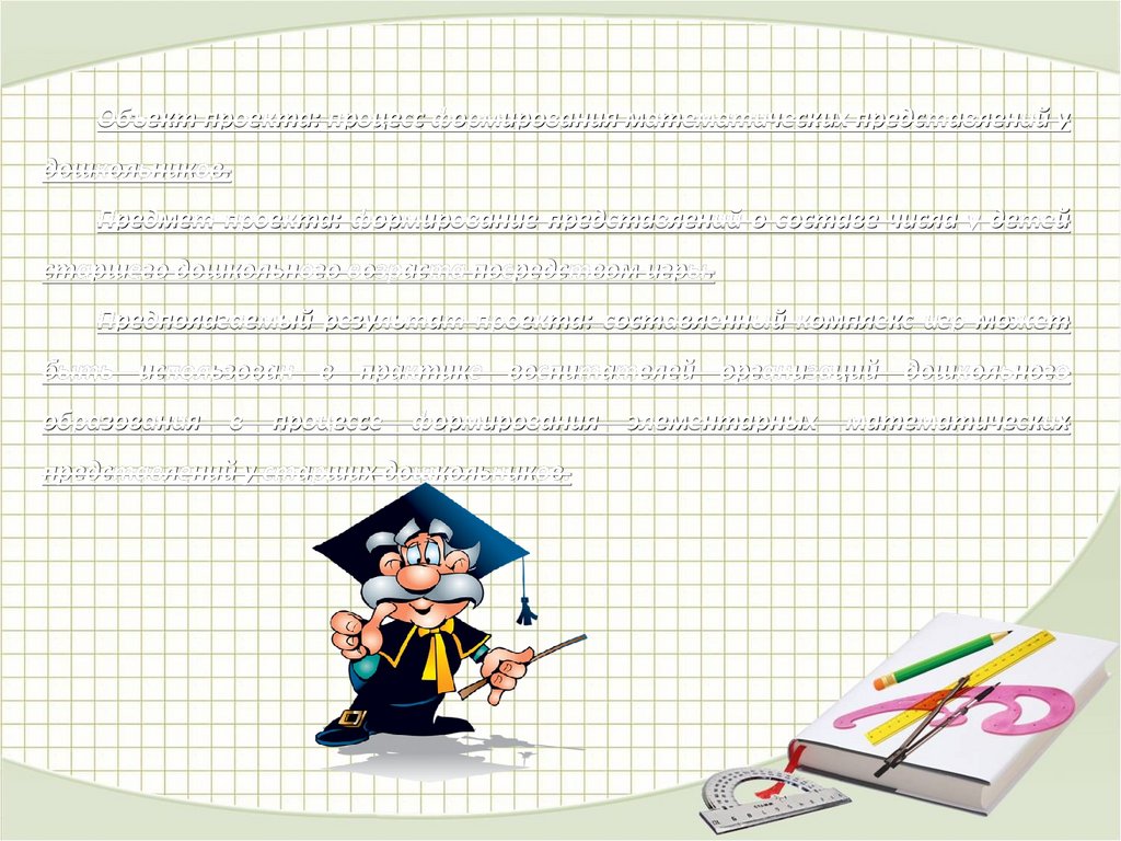 Объект проекта: процесс формирования математических представлений удошкольников.